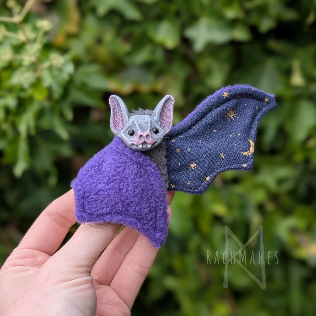 Bebe bats are made using a soft plush minky fabric for their bodies and a combination of polar fleece and patterned cotton for their wings, these dolls have a solid resin cast face, and a wire skeleton in their plushie bodies and wings that make the head and wings posable.