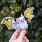 Bebe bats are made using a soft plush minky fabric for their bodies and a combination of polar fleece and patterned cotton for their wings, these dolls have a solid resin cast face, and a wire skeleton in their plushie bodies and wings that make the head and wings posable.