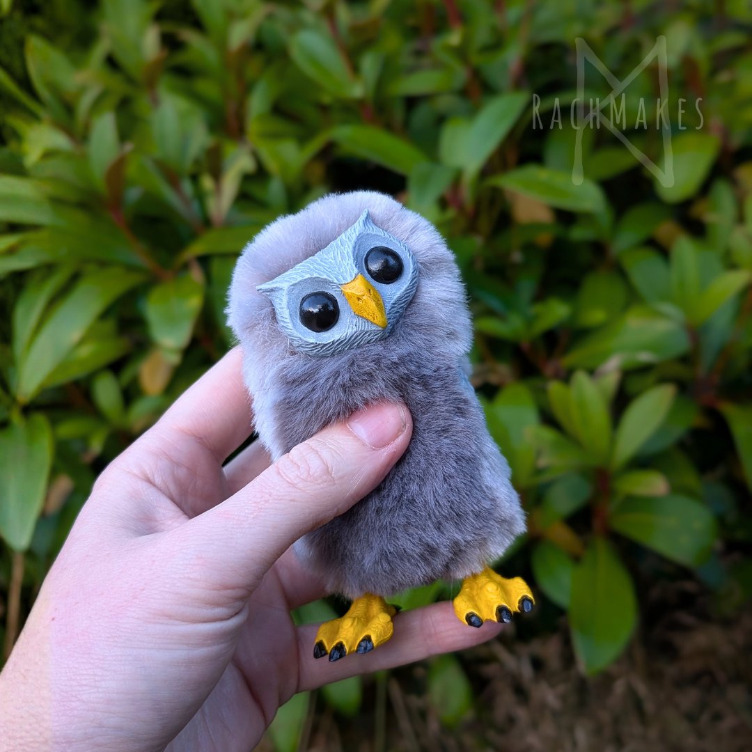 This hootling has super soft grey floof ! They stand at just under 4 inches tall.